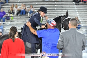 Class 44 was next, English Lite-Shod, with Robert Cortner serving as the call judge. Six of seven entries made their way into the Big Oval. The competition was heated as these expert lite-shod trainers competed for the honor of world champion, putting their horses through their gears around the track. After the cards were tallied, it was the duo of Senorita Carmelita and Jimmy Baumgardner who made the victory pass for Salt Lick Farm and Elese Lewis of Salt Lick, Kentucky. They are no strangers to The Celebration, winning the Novice Lite-Shod World Championship in 2023, and have won at the Derby Classic and Owingsville Lions Club this season. Next in the good class, walking out with reserve, was Red Rum SS with Patrick Thomas riding for Dr. Gary Pope of Taylorsville, North Carolina. They were the Five & Under Lite-Shod World Champions in 2024. The third-place tie went to three-time World Champion Two Guns and Blake Cammack.