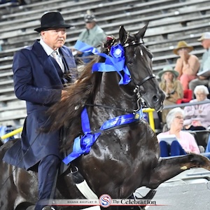 Class 95 brought the young riders back into the ring with Owner-Amateur Youth 6-14 on Ponies. Judge Sisk called the class once the seven entries were in the ring. The young riders held nothing back as they kicked their horses up into a flat walk and strode around the ring. The competition was fierce. This time, the world championship went to I Am March Madness and Ryder Wright riding for himself and Debbie Woods. I Am March Madness adds this to wins at the WHTA National Trainers’ Show and his Three-Year-Old Stallions World Championship from 2022. Second out of the lineup was Duracell CF and John Winston Clark, the owner and up, of Arab, Alabama. They have had a year of wins at Christmas In July and the Red Carpet Show Of The South. This was Duracell CF’s first year showing at The Celebration.