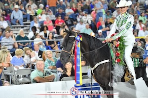 Class 200 ushered in the Owner-Amateur Four-Year-Olds. With Robert Cortner calling the class, 12 of 13 entries came down the hill and into the ring. Receiving the first-place tie, along with the tricolor ribbon and floral horseshoe, was Java with Nathan Oliver riding for The Dale Oliver Family of Bowling Green, Kentucky. This was Java’s first Celebration blue and it was a world grand championship ride. Java won at the Columbia Spring Jubilee and Let Freedom Ring shows earlier in the season and was sired by Master Of Jazz out of a Texas Joe Black mare. Second in the class, wearing the red and gold ribbon, was On Charlie Time and owner Greg Kiser of Rosedale, Virginia. On Charlie Time won this year at the ETWHA Ladies Auxiliary and Waynesville Charity show. Walking out of the lineup to a third-place finish was I’m Full Of Honor and Amy Ann Hurst for Mike McCormick and Amy Ann Hurst.