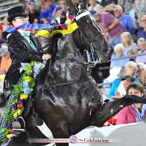 SHELBYVILLE, Tenn. – The last night of The Celebration had come. With spectators and exhibitors all in their finest attire, the stands crowded with people waiting to watch the crowning of the 2025 World Grand Champion. Prior to the usual Saturday night performance,Creek View Stables along with Sugar Creek carried on with their tradition of sponsoring the annual Stick Horse class, free to all willing participants aged seven and under. An amazing 203 entries participated in the show ring experience, and every entry got a blue ribbon for their mount, and free ice cream sponsored by Murfreesboro Pure Milk for all their hard work. Then it was time for the festivities to get underway at precisely 7PM. White Diamond Dollar and Vicki Self carried the flag around the ring and parked over on the west side. Dan Ashey of the First Christian Church gave the invocation, and Craig Campbell of Eagleville sang the national anthem. Then, Steve Bowman sounded the bugle call for the first class.