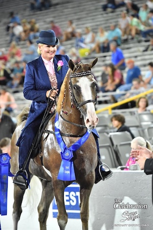 All eight listed in the program were ready for the coveted Lead Line World Grand Championship. Making the first spotlight ride of this year’s Celebration was the team of Vivian Woodruff of Shelbyville, Tennessee, and Rattle & Snap. It was the fifth blue in a row for the team. Queen Elizabeth was reserve with Lexi Grace Cofer riding and her grandmother Dee Yoder serving as the handler. Wylder Way was third aboard Band Wagon with sister Jayden Jackson at the lead.