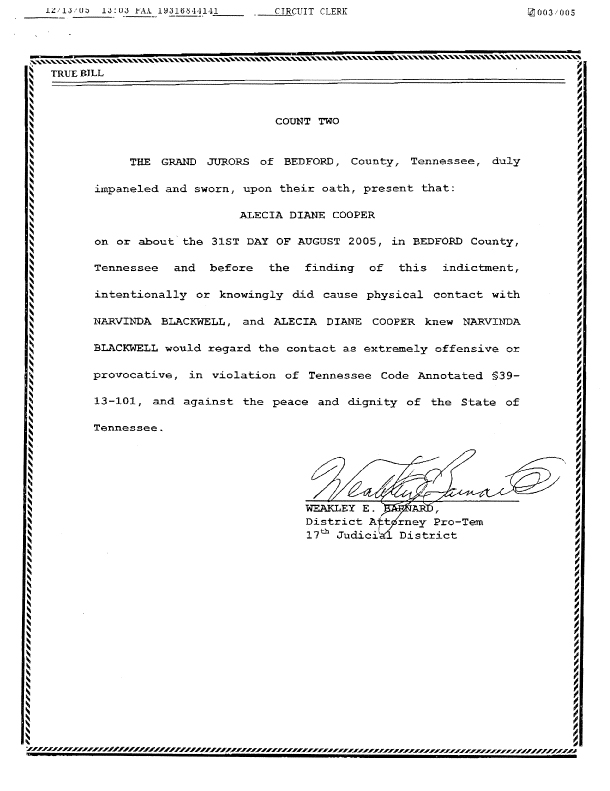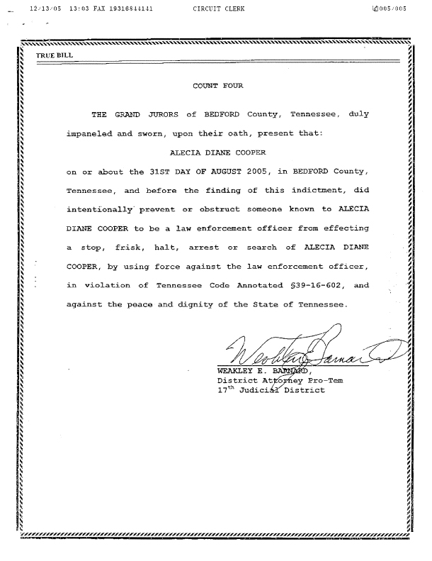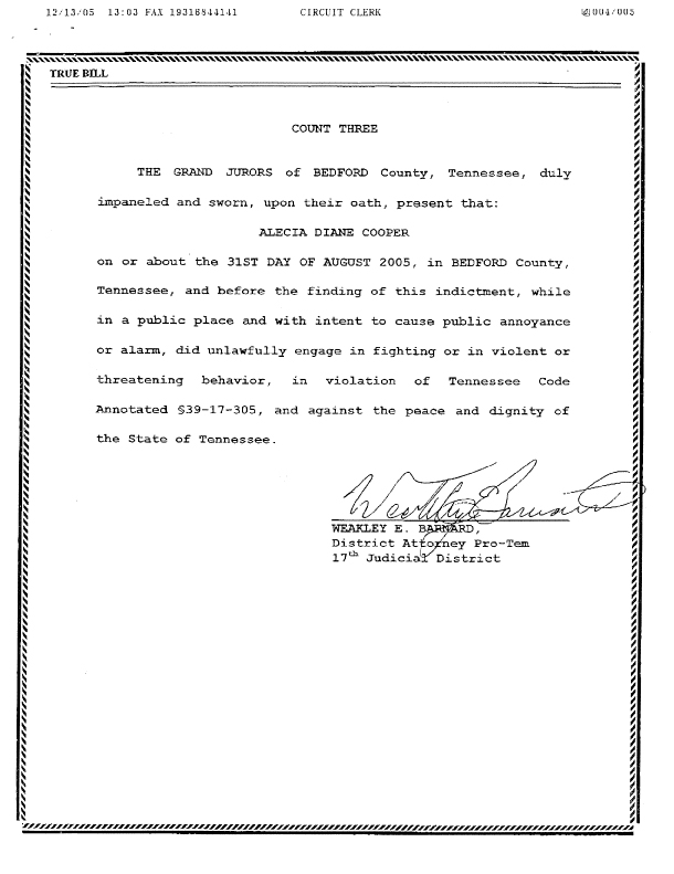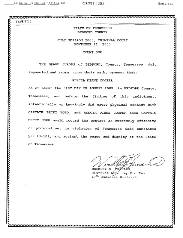 The Bedford County Grand Jury returned a four count indictmentagainst Alecia Cooper stemming from her confrontation with Becky Hord whileattempting to enter the inspection area during the 2005 Tennessee WalkingHorse National Celebration. Cooper had earlier filed suit against both The Celebration and Hordseeking $1,250,000 in compensatory and punitive damages over the incident.Hord is a Captain with the Bedford County Sheriff's Department and Cooperwas an exhibitor at the 2005 Celebration. The indictment reads as follows: