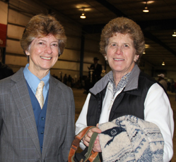 Lynn Hickok was on hand to congratulate Barbara Corbett following her winning ride with American Threat in the Adult Ponies class at the Spring Warm Up.