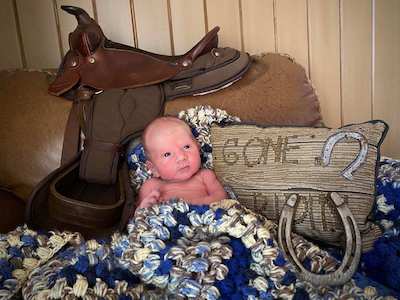 His mom is the former Maisie McSwain that enjoyed World Grand Championship rides on Gen's Sundance Lady, The Lady's Man, and twice on The American General and twice on Victoria's Secret. Jack's first outing upon arrival was to their barn at home to meet the horses.