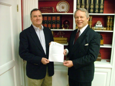 WHTA 1st Vice President Allan Callaway (left) accepts a letter of commitment from Celebration Chairman John T. Bobo. The Celebration has pledged $25,000 toward the construction of the new Trainers' Association headquarters in Shelbyville.