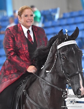 Six riders, all previous world champions, answered the gate call for the Owner-Amateur Riders on Western Lite-Shod Walking Horses; the halfway point of the morning performance. For the third consecutive year, it was the team of Lisa Baum and Big Time Bandit who heard their names called as the champions. The reserve streamers went to My Black Cadillac and Allison Thorson, with Miss Dixie Flyer and Donna Byard accepting third place honors.
