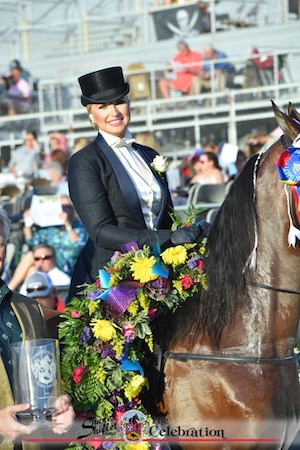 Fly Dragonfly and owner-rider Dr. Shannon Harr from Olive Hill, Kentucky, were presented their first ever world grand championship in the Owner-Amateur Novice Riders on Novice Walking Horses class. It was the fourth blue in 11 shows for Fly Dragonfly including top honors in the Owner-Amateur Novice Gentleman Riders on Novice Walking Stallions class Saturday night. The Jackalope, with Tyra Brown aboard for Tim Brown, was reserve world grand champion, while Doral and Samantha Green tied third for owner Evergreen Walking Horse Farm, LLC.