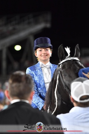 Dixie Dare Devil and Claudia Gribble received the world grand championship for owner Ella Abernathy from Olive Branch, Mississippi, in the Owner-Amateur Riders on Two-Year-Old Walking Horses class. Sired by The Dixie Lineman and out of Magic’s Jazzy Lady, it was the second blue in five classes this year for Dixie Dare Devil. Gribble and Dixie Dare Devil also won the Owner-Amateur Two-Year-Old Stallions, Section B class the first Thursday night of The Celebration. Peace In The Valley CTF earned reserve honors with co-owner Gabriel Humiston in the saddle for co-owners Mark and Sharon Thomas. Gunsmith and David Sisk tied third for owners Dr. Andrew and Linda Sisk. Paul Robbins was the call judge with 11 of 16 programmed entries competing.