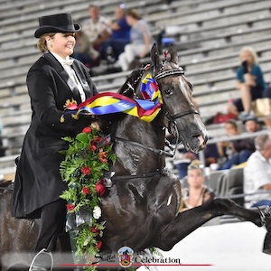 All About Jose’ with owner-rider Jackie Whatley from Ocala, Florida, in the saddle walked to the world grand championship in the Elite Owner-Amateur Riders on Walking Horses class. Last year Whatley won the Owner-Amateur Novice World Grand Championship. Sired by Jose’ Jose’ and out of Crystal Lite’s Sunshine MM, it was the second top finish in The Celebration with Whatley and All About Jose’ earning a first-place nod Monday night in the Elite Owner-Amateur Lady Riders on Stallions class. It was the fourth blue for All About Jose’ in six classes this show season and his third in a row. Reserve was Mr. Heisman with co-owner Bruce MacDonald riding for co-owner Robin MacDonald. A King Thing and owner-rider Bob Adcock carried away a yellow ribbon. Ten of 12 expected entries competed. Sam Sorrell was the call judge.