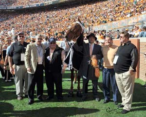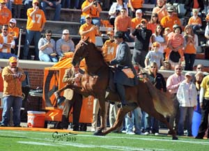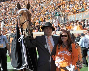 KNOXVILLE, Tenn. – 2010 World Grand Champion Tennessee Walking Horse The Coach was exhibited in front of over 96,000 orange-clad fans at the University of Tennessee Homecoming game against Ole Miss on November 13, 2010. Once again, the world grand champion was hosted by UT Athletics board member David Howard and the University of Tennessee Veterinarian school.