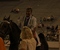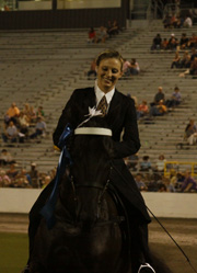 Class 127 brought the Owner-Amateur Riders on Walking Mares or Geldings, 15.2 & Under down the hill with 12 of the 25 programmed entries beating the clock to work for World Championship honors in the division as Leigh Stuart served as call judge. Picking up her second blue of the night, Robin MacDonald was in the winner’s circle this time after making a great performance with Rocky Mountain Sky riding for Bruce and Robin MacDonald of Atlanta, Ga. With this win, coupled with her 2006 win with It’s Taboo, this team retired the Dr. J. Daniel Bateman Memorial Challenge Trophy. She retired the Challenge Trophies in the other class tonight as well. I’m Stan The Man and Dr. Lynda Brogdon were reserve for Ben and Dr. Lynda Brogdon of Tallahassee, Fla. Lindsey Lohan and Kim Butler were third for Bruce Butler of Morehead, Ky.