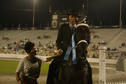 Promptly at 7 p.m., the historic gate swung open and welcomed official flag horse Counterfeit Dollar and Bud Seaton to the track with our nation’s colors.