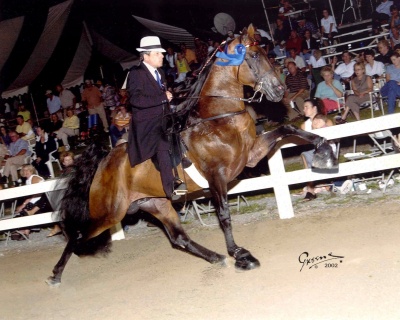 Image was bred and raised by the Bob Parks family. The young bay stallion by Pride’s Jubilee Star was started by Wink Grover and made his show ring debut by winning the Two-Year-Old Stallion class at the Trainer’s Show in 1993. Parks also claimed the blue in the amateur division at that same show. As a four-year-old, Image was moved to Ramsey Bullington Stables where he continued to win at major shows throughout the South including Lewisburg, Belfast, Fun Show, Alabama Jubilee and the International.