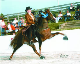 He was purchased by and carried Virginia Stewart to a blue in the Amateur Novice Specialty Championship at the 36th annual National Trainers’ Show in a class of 15 in 2004. Since that time Stewart has enjoyed many rides with many ribbons throughout the years that she owned him. They were a favorite in the Pro-Am classes with David Landrum directing him the second way. Stewart loved watching Landrum show him and this was one of her favorite memories of this great stallion. His legacy will continue through his offspring. He has five yearlings that will follow in his hoof-steps.