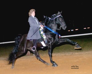This big black mare had a commanding presence in the ring and will be sorely missed in the upcoming show season. She was an outstanding show mare, but an even more incredible ambassador for the breed. Pride’s Lady Dia was owned by Sadie McLeod, ridden by Beverly McLeod, trained by Tommy Blackwell, and loved by all.