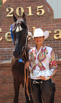 Making the gate call were seven impressive entries in the O/A Riders on Four-Year-Old Trail Pleasure Walking Horses, Optional Tack. Judge Sisk served as call judge for this class. Taking the unanimous tie and World championship title was The Black Mamba and LaMar Depoyster for Gordon and LaMar Depoyster of Greenville, Ky. This world champion team has enjoyed an undefeated season in 2015 claiming top honors at the National Trainers Show, the Derby Classic and Woodbury Lions Club show. Reserve honors went to My Black Cadillac and owner/rider Allison Thorson of Huron, OH. My Black Cadillac has enjoyed top honors at such impressive shows as the Mississippi Charity and the National Trainers show earlier this year. Rounding out the top three was Magellan and owner/rider Alex Johnson of Limestone.