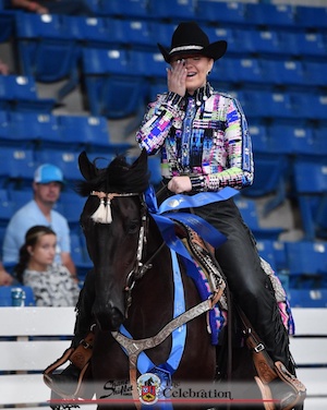 It was back to a western state of mind with three of the seven horse and rider combinations on the books walking their way up to Cooper Steel Arena in the Owner-Amateur Western Lite-Shod class. Derek Bonner handled the call judge responsibilities in the class. No stranger to the Celebration winner’s circle, it was Hello I’m Johnny Cash with Liz Thomas in the irons called to accept the world championship blue ribbon for Thomas, Tackett, Adams and Macey of San Jose, California. The Master Of Ceremonies and Terry Moran finished in reserve for the Darnell and Moran partnership, while Kiss This Girl and owner Nic Linder were presented with the third place ribbon.