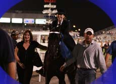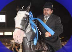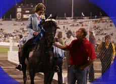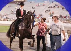 Class 96 was one most Sunday night fans on hand had been waiting on all night, the Four-Year-Old Walking Stallions (Canter) (Riders’ Cup). Thirteen entries made the gate call to show off for the Sunday night crowd as Judge Nathan Clark called the gaits. The crowd was certain not let down as the Junior Stallions put on an outstanding show, to say the very least. Topping the great class was the reigning Three-Year-Old World Grand Champion, Folsom Prison Blues and Rodney Dick riding for Judy McDonald of Tullahoma, Tenn. This win was preceded with 2010 wins at the Gulf Coast Charity Celebration, the Columbia Spring Jubilee and the Red Carpet Horse Show of the South at Pulaski, Tenn. Dark & Shady and Jimmy McConnell, 2010 champions at the National Trainers’ Show, the Mississippi State Charity Horse Show, the Germantown Horse Show and the Money Tree Classic, pulled into the second position for the Molly Walters family of Rancho Mirage, Calif. Jail Time and Casey Wright, 2010 champions at Nettleton, Miss., the Spring Fun Show and Parker’s Crossroads, Tenn., were a popular third for Eddie and Tina Smith of Jackson, Tenn.