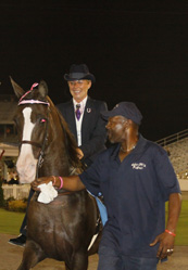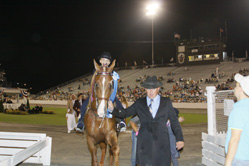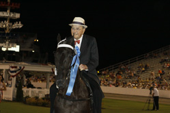 A much anticipated class was up next on the evening’s schedule. Class 48 featured the Owner-Amateur Riders on Walking Horses, Riders 70 Years & Over. This is a great class to demonstrate the easy going, docile nature of the Tennessee Walking Horse, as it is a horse that someone in their 70’s, 80’s, or even 90’s can continue to show and find success. Thirteen entries made the call to work as Jamie Bradshaw called the gaits in the class. This class certainly didn’t let anyone down. These riders still know how to put on a show and each and every one did just that tonight. But only one could win the blue and that blue went to a familiar face, Dr. W.H. Hill and Kudos For Cash. Now, if you’re not aware, Dr. Hill is just a little past 70, he’s in his 90’s . . .94, if this reporter is not badly mistaken and still riding in high style. This is the third consecutive year that Dr. Hill has won this class with Kudos For Cash and he won the class in 2006, 2007, 2008 and 2009 on Cash’s All Star. Reserve honors in the class went to Ritz’s Big Dipper and Heidi McWilliams riding for McWilliams Farm/Jim and Heidi McWilliams of Cookeville, Tenn. Lined With Poison and Lucky Collins pulled into the third position for Don and Lucky Collins of Bell Buckle, Tenn.