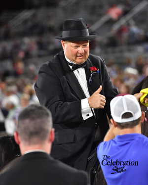 Twelve entries graced their presence in the Amateur Two-Year-Old World Grand Championship, the second to last class of the night. The winning rider of this class is very familiar with the winner’s circle as he retired two challenge trophies on this night. After announcer Mark Farrar called Jason Myatt and As I Am — who won their preliminary class last week after previous season wins at Christmas In July and Walking For The Children — Farrar made the win even sweeter when he informed the crowd it was Myatt’s third year in a row to win the title, on different mounts each year. Last year he won with I Am Mighty José and in 2016 he wore the roses out with equine partner Knock Down Drag Out. The reserve champion in this class was A Kingpin and Bob Adcock.