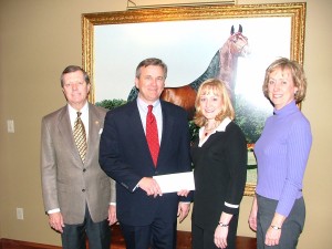 Celebration CEO Ron Thomas joins Robert Davidson of Davidson, Golden & Lundy, P.C. as he makes a $2,500 donation to Great Strides president Mary Leta Shavers and Kay Dennis. The donation, along with $2,500 to the Tennessee Walking Horse Museum Foundation, was made in the name of Mr. and Mrs. Frank Neal. The horse in the background is 1992 World Grand Champion Dark Spirit's Rebel, owned by the Neal family.
