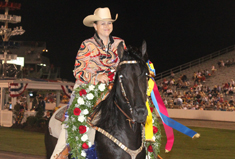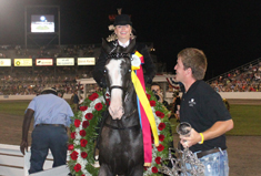 Well, it was finally time to hand out some roses! Class 152 brought the Western Lite-Shod Walking Horses World Grand Championship to the ring. All five of the expected teams made the call to work for championship acclaim tonight as Judge Connie Waldo called the gaits. Riding to the tri-color and securing their second set of roses after winning the Open English Lite-Shod WGC last evening, was Catastrophic and owner/exhibitor Laurie Toone of Shelbyville, Tenn. Lil Wayne and Bobby Richards were reserve for Jeff Gillespie of Tazewell, Va. GiGi’s Jamaican Generator and Leigh Stuart were third for Kaitlyn Rippy of Greenbrier, Tenn.