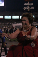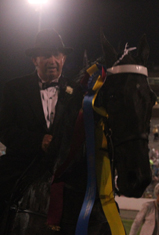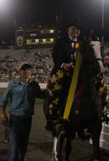 The Trainers “Ride for the Roses” World Grand Championship (Riders’ Cup), class 158 was up next. This is a fairly recent addition to The Celebration schedule, but has been a very well received class. The class is for trainers that have never won a World Grand Championship and they must have shown (horse and rider) at the 2012 Celebration. Thirteen of the 21 on the official Lions Club program made their way down from Calsonic Arena in hopes of riding away with their very first set of roses tonight. Judge Chris Bobo served as Call Judge for the class. Making that first ever spotlight ride tonight and taking the honors back to Southwest Virginia was the team of ACC and Steve Hankins up for Rick Compton of North Tazewell, Va. Miss Ebony Rose and Ross Campbell collected the red streamers for Sudie Reed of Jasper, Ala. I’m Splashed and Tim Smith were in the third position for Hillview Promotions and Lindsey Landrum of Tupelo, Miss.