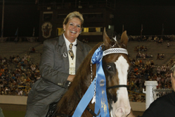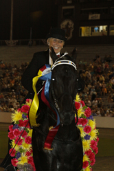 The 15.2 & Under Walking Horse World Grand Championship (Canter) (Riders’ Cup) was up next with four entries making the call to work for Rollie Beard and his panel. The class may have been one of the smaller ones of the night, but was a four-horse workout from start to finish and it certainly got the crowd as excited as any class did all night. However, only one of these four excellent teams could walk away with the roses and that would be the 15.2 & Under Stallion preliminary winner, A Strong Need For Cash and Michael Wright riding for Jim and Jeanne Roberts of Wildersville, Tenn. This team captured this title with a unanimous decision of the panel and the approval of the Friday Night crowd. BeeBee King and Jimmy McConnell were reserve for Mary Medina of Skillman, N.J. I’m Breakin’ Bad and Winky Groover was third for Dr. John and Amanda Odom of Rincon, Ga.