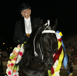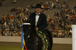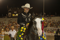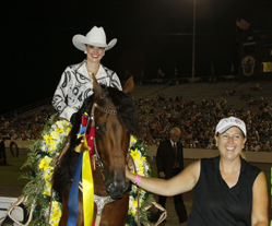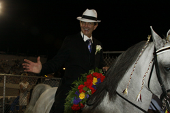 After that winning ride, it was time for 2002 World Grand Champion Out On Parole and trainer Steve Dunn to head down the hill and make their final ride in the big oval as Out On Parole was formally retired tonight in the big oval. The crowd cheered loudly as he made his way around the ring under the spotlight. As announcer Bobby Sands read all of OOPS many accolades, Steve Dunn and OOPS continued to show their stuff and the crowd around the ring continued to cheer. Finally, it was time to remove the saddle and replace it with the retirement blanket. Then, Steve and OOPS made one final walk in the spotlight with “Simply The Best” playing in the background. A great retirement ceremony for a great horse indeed.