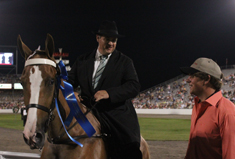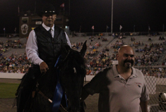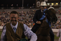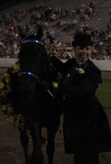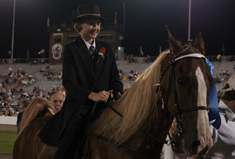 As is Celebration tradition, the official flag horse, Counterfeit Dollar and World Grand Champion rider Bud Seaton, were waiting at the gate at 7 p.m., anxiously awaiting the opening ceremonies getting underway. The invocation for the evening was given by Rev. Stephen Caine of First Presbyterian Church, Shelbyville, Tenn., followed by the singing of the National Anthem by Wess Adams of Shelbyville, Tenn. Bobby Sands, the Celebration’s official evening announcer was unable to attend tonight due to a family wedding, so morning announcer Mark Farrar, Jr., capably handled the duties in his absence.