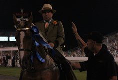 Young Trainers, 35 Years & Under, on Walking Horses, 15.2 & Under (Riders’ Cup), class 74, was up next on the program. Nine of the 20 programmed entries worked down to the historic big oval to show for Judge Joel Weaver and his panel. Riding to the win with a unanimous decision of the panel was I’m Packin’ A Pistol and Aaron Self up for Rick Compton of Tazewell, Va. I’m Packin’ A Pistol is a “Classic Horse,” meaning one that is 15 years of age or older. What a statement that a horse of that age is still able perform at a World Championship level. I’m Splashed and Tim Smith were reserve for Karla Landrum of Franklin, Tenn. Skywatch’s Masterpiece and Bill Callaway were third for Bill Hill of Knoxville, Tenn.