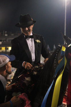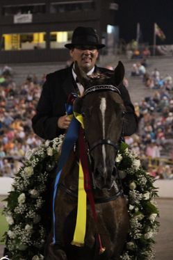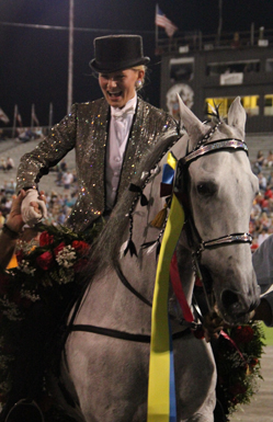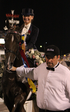 As the 77th Annual Tennessee Walking Horse National Celebration comes to a close on Saturday evening, the track was prepared for the best of the best. The last class of the evening is the all prestigious Tennessee Walking Horse World Grand Championship (Canter), which crowns “The Champion Walking Horse of the World.” Spectators took to their feet as each entry was called to the ring individually. Larry Bright tuned the organ and called the world grand championship contenders to the ring with the National Anthem of the Walking Horse world, the “Flatwalk Boogie.” Claps, whistles and cheers welcomed these top contenders to the ring. Five talented teams answered the gate call and Judge Bingham served as the call judge. During this particular class, judges not only look at the horses natural ability and gait, they also make their decisions based upon the horses overall confirmation. After the horses are worked both ways of the ring, the saddles are removed and the horses are then judged solely upon physical confirmation. As the class went on its final reverse, all spectators in attendance were on their feet and graciously cheering on their favorite teams. Taking home the tri-colored ribbon, floral horseshoe, honor, glory, bragging rights and most of all the title of the 77th annual Tennessee Walking Horse World Grand Champion was the team of I Am Jose' and Casey Wright for proud owners Billy and Debbie Woods of Lexington, Tenn. This team has the crowd on their feet throughout the entire class. This prestigious win makes I Am Jose' only the second horse to ever win the World Grand Championship three years in a row. With this win, they also retire all of the challenge trophies offered tonight. With great applause from the audience, the reserve world grand championship honors went to He’s Vida Blue and Chad Williams for Gayle Holcomb of Marina Del Rey, Calif., and Shelbyville, Tenn. This powerhouse team claimed the reserve world championship title earlier in the week in the A division of the Aged Stallions. Picking up the yellow streamer in this prestigious class was Gen’s Black Maverick and Bill Callaway for Keith and Lorraine Rosbury. With a final historic victory lap, another year is in the books for the Tennessee Walking Horse National Celebration.