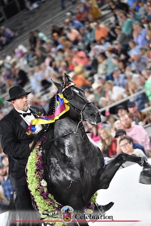 Two of the three listed entries worked for call judge Kenny Smith in the Park Performance World Grand Championship. The unanimous selection by the judges to ride out with the floral horseshoe and tri-colored ribbon was Praise And Honor, ridden by Jeff Laughlin for Doris Penick from Walterboro, South Carolina. They have four top honors in a row this show season in five classes. They were first in the Park Performance Five & Under class the first Wednesday night of the Celebration. So Real was reserve with Patrick Thomas aboard for Cynthia and Marian Wright.