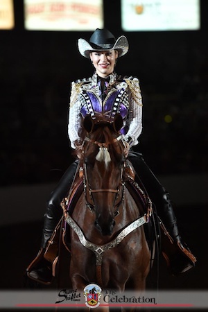 Blacklist made the spotlight ride in the Trail Pleasure World Grand Championship for the third time, this time with Carrie Martin DeJarnette in the saddle for new owner Jane Pirolo of Franklin, Tennessee. Blacklist has 11 Celebration world titles. This year, Blacklist has eight blues in 12 classes, including the Owner-Amateur English Trail Pleasure in morning classes the first Wednesday of the Celebration and the Trail Pleasure class with DeJarnette Tuesday night. I’m Thunderstruck N.D.R. placed reserve with David Mast riding for Wayne and Debbie Simons. He’s A Knight Rider and Joe Lester rode to a yellow streamer for Andrea Coleman. All three program entries competed for call judge Leah Boyd.