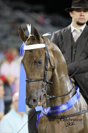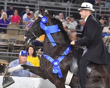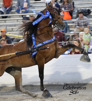 The first of three sections of the two-year-old stallions, the evening’s highlight, came together for round one in the next class and the crowd went wild when Mark Farrar announced Tua MCF as champions for hometown owners Keith and Lorraine Rosbury, who were cheering the loudest among all of the rowdy fans. Well over a dozen contenders performed up to the high expectations of Celebration goers and Shelbyville was not disappointed as another local favorite, Herbert Derickson, put in the performance fans have come to expect as he piloted Mr. Magnifico to a performance that lived up to his name for the reserve in the A section.