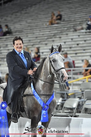 Cousin Bob and owner-rider Dee Broom from Nashville, Tennessee, made the winning ride in the Owner-Amateur Riders on Walking Stallions class. Cousin Bob, sired by Jazz King, has four blues in five classes this year. Owner-rider Sarah Coffee Burks was second with The Iron Door, while Good Samaritan received the yellow ribbon with co-owner Pam Russell on board for co-owner Larry Russell. Nine of 29 entries entered the ring prompting announcer Mark Farrar to explain that many horses are entered in multiple classes. Amy Trimble was the call judge.
