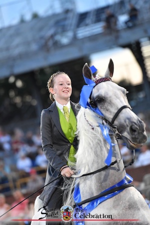 It’s The Medalist and Eli Cunningham are no longer Celebration novices with the win in the Owner-Amateur Novice Youth Riders 6-11 Years on Novice Walking Mares or Geldings class for co-owners Brittney Cunningham and Melissa Wilson. It was the second unanimous selection of the night by the five-judge panel. Sired by The Titleist, It’s The Medalist has five blues in nine classes this show season including a third at this year’s Celebration. I’m On Good Behavior and rider Mary Beech Alias were second for owner Margaret Ann Alias, while Good Time BKT and owner-rider Boston Kate Tillman tied third. Eighteen entries were listed in the program with 10 in the ring. Amy Trimble was the call judge.