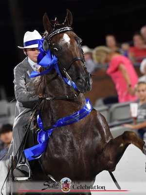 Escapee and owner-rider Heidi Mott from Maryville, Tennessee, escaped their Celebration novice designation in the Owner-Amateur Novice Riders on Novice Show Pleasure Walking Horses class. Sired by Out On Parole, Escapee has shown in eight classes this season with five blues, three in its last three outing. All American Silver and Tim Stevens were reserve for The Tim Stevens Family, while Evan William’s Black Label and owner-rider Jacob West received a yellow ribbon. Eighteen of 30 programmed entries answered the gate call, the largest class of the night. Paul Robbins called the class.