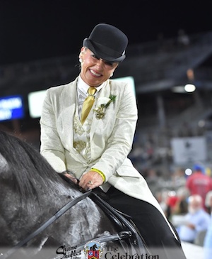 John Puckett called the Elite Owner-Amateur Gentlemen Riders on Walking Mares or Geldings class. Nine of 15 programmed entries were in the ring. Uptight Jose and co-owner and rider Bruce MacDonald rode into the winner’s circle in the class for the second year in a row. Robin MacDonald of Shelbyville, Tennessee, is the co-owner. Sired by Jose’s Citation, it was the second blue in four shows this year for Uptight Jose who also has world championships in the Elite Ladies Owner-Amateur Mares & Geldings class in 2020 and the Owner-Amateur Stallions class, both with Robin riding. A Home Run By Ted and owner-rider Greg Kiser tied second, while Miss Stone’s Cash and co-owner Noel Botsch carried home a yellow ribbon for co-owner Lynda Botsch.
