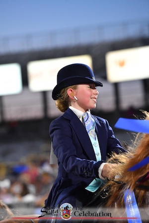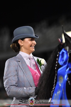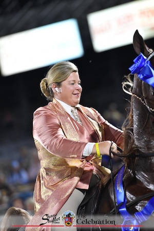 After a brief delay, the Owner-Amateur Novice Lady Riders on Novice Walking Mares or Geldings, Division B, got underway with 13 of 18 scheduled entries making the show ring. John Puckett was the call judge. Also losing their Celebration novice status were Lady Elle and owner-rider Kelly Manis, who has been riding in The Celebration for 25 years. Reserve was I’m Deuce, a classic horse, with co-owner Marla Lovett on board for co-owner Rick Lovett. Touchlined claimed third for owner-rider Carol Shelton.
