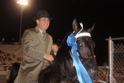 Class 23 brought the Elite Owner-Amateur Gentleman Riders on Walking Stallions down the hill to the track with seven of the 10 on the official Lions Club program taking the rail as Derek Bonner served as call judge for the second class of the night. Making the memorable victory pass was a familiar team, Kid Callahan and Ed Breedlove riding away with the blue for Genevieve Breedlove of Buford, Ga. This makes the fifth time that this team has ridden to the winner’s circle in this division, after winning in 2007, 2008, 2009 and 2011. Heartline and owner/exhibitor Sam Sorrell of Lexington, Ky., was reserve in the class. More Of The Major and owner/exhibitor Ron Lawrence carried third back to Lenoir City, Tenn.