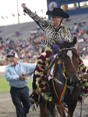 The eight-horse finale had an equal array of favorites spreading the crowd’s support across the board. After normal rail work, saddles came off as entries were judged on their conformation prior to all eight going back on the rail. Just as enthusiasm was at an all-time high and the horses were about to head to the line-up, one horse, A Bruce Pearl, threw a shoe and another rider, Chad Way, lost his stirrup, both which caused a slight delay in the show. After the timeout was finished and just before 11:30 p.m., organist Larry Bright appropriately played ”All Shook Up,” then “I Love You Just the Way You Are” before the contenders made one more pass along the rail before the winner was finally announced.