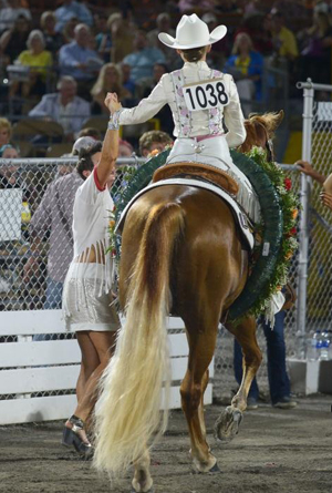 The crowd was revved up once again for the third to final class of the night, the 14-entry Amateur Four-Year-Old World Grand Championship, where last year’s Three-Year-Old World Grand Champion in the open division carried Kyndra Myers to the win of a lifetime in front of a crowd that loved watching her win. This was her first world grand championship ride, which she did representing owner Sherry Roberts. The crowd also sent off the reserve finishers — A Classic Action and Diana Cruse — with Celebration love as they also made a worthy performance in front of the many who came out to enjoy the show.