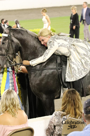 A break in competition brought an amazing treat for the large Celebration crowd. Newly crowded World’s Champion of Champion I Am What I Am (the Saddlebred industry’s new Junior Five-Gaited Grand Champion) was expertly guided to Maverick Arena by trainer Suzy Shiflet. Suzy directed the stunning four-year-old mare around the ring wowing the crowd step after step.