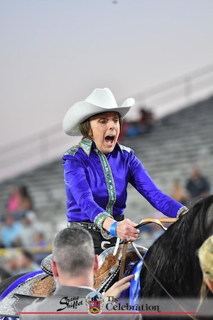 Up next was the first of three split in the Two-Year-Old Stallions class. Thirteen of 23 programmed entries rode in the class. Shoulda Been A Cowboy and Sam Martin were called from the lineup to accept the first place awards for Floyd Sherman of Shelbyville. They were the first place tie in the class, and also walked out with the National Futurity Championship. They were the unanimous choice of the five-judge panel. General Thomas J. Jackson was reserve with Michael Wright in the irons for Shannon and Ed Cotter. He’s Old Crow earned the third place award with Derek Monahan in the saddle for Ginger Williams.