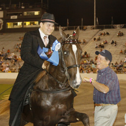 Classic Park Pleasure Walking Horses (Riders’ Cup), class 110, featured seven of the nine with reservations working under the watchful eye of Leigh Stuart and her panel. Making the winning ride in the class was Double Shot Of Cash and Laurie Toone up for Tamara Hader of Bainbridge, Ga. This made their second World Championship of the day as the team captured the Four-Year-Old Park Pleasure blue earlier today. Motown’s Title Masterpiece and Steve Sanders were reserve for Sonny and Debbie Sanders of Brownsboro, Ala. Lil Wayne and Bobby Richards rounded out the top three for Jeff Gillespie of Bainbridge, Ga.