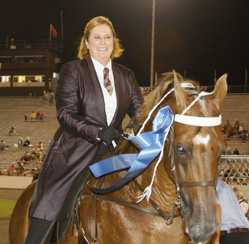 Class 109 featured the Owner-Amateur Riders on Five-Year-Old Walking Stallions with 11 of 14 on the officiall Lions Club program working down the hill to show for the Monday night crowd as Allen Forman called the gaits for the class. Making the victory pass tonight was Gin Toddy and owner/exhibitor Sue Irby of Shelbyville, Tenn. This win was preceded with 2013 wins at the National Trainers’ Show, the Spring Fun Show and Money Tree Classic. I’m Pushin’ N Line and Janice Fostek collected the red streamers for Joe Fostek of Roanoke, Va. The Jazz Player and Edith Dilday picked up the yellow ribbon for Dilday and Blackburn of Dresden, Tenn.