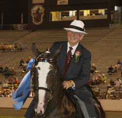 Class 112 was up next on the schedule, Owner-Amateur Riders 50 & Over on Park Pleasure Walking Horses with eight entries making the call to work for Allen Forman and his panel. Riding to the winner’s circle was Lined Up At The Ritz and Jim Nichols up for Rowan and Nichols of Bluemont, Va., and New Market, Tenn. BB King’s Jazz and Libby Stephens were reserve for Womack and Stephens of Grayson, Ky. Rev’s Flashback and Betty Laughlin were pulled into the third position for Jo Laughlin of Waynesville, Mo.