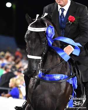 One of the most anticipated competitions of the Celebration was the Two-Year-Old Walking Stallions and Section A did not disappoint with 14 strong entries put through their paces by call judge Rollie Beard. Kobe 24, wearing No. 24, was a crowd favorite with Tim Smith in the saddle for the world championship performance for the partnership of Barnes, Conner and Kilgore from Sevierville, Tennessee and Tuscaloosa, Alabama. Kobe 24 was the unanimous choice of the five-judge panel. The pair remain unbeaten with four victories this year. Balboa and Casey Wright earned second for Alan Riddley. He’s A High Dollar Deal was third with Charlie Green in the stirrups for Don Collins.