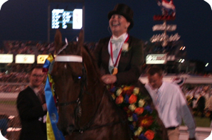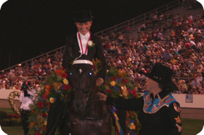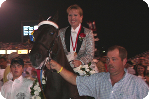 Once that was complete, Mr. Sands instructed all of the riders to remount and asked the grooms to retire and Call Judge Carpenter asked all of the entries to return to the track for additional work to determine just who would wear the roses tonight. When the work was finally complete, the spotlight was turned on to search for just who the 2009 World Grand Champion would be and when the spotlight stopped, Bobby Sands called the team of Watch It Now and Jimmy McConnell, 2009 Aged Stallion, Div. A, Reserve World Champions, to the winner’s circle for Waterfall, L.P. of Atlanta, Ga. & Shelbyville, Tenn. This win marked McConnell’s third win in five years with his first ever coming in 2004 with The Black Night Shade, then next in 2007 with Master Of Jazz, preceding this win tonight. Quite an accomplishment indeed.